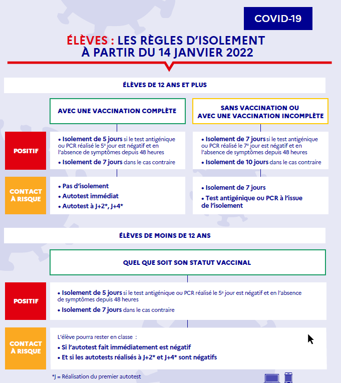 Vous trouverez en pièce jointe les nouvelles règles d'isolement à partir du 3 janvier 2022 en pièce jointe.